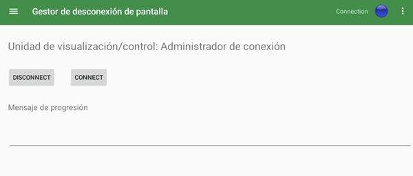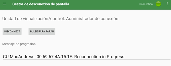 Esta función le permite forzar la desconexión de la Pantalla externa de la Unidad de Control y no intentar ninguna reconexión. Mientras la Pantalla está desconectada, puede realizar otros pasos de solución de problemas necesarios en la unidad de control. Una vez que se complete la solución de problemas, use esta página para volver a conectar la Unidad de Control.