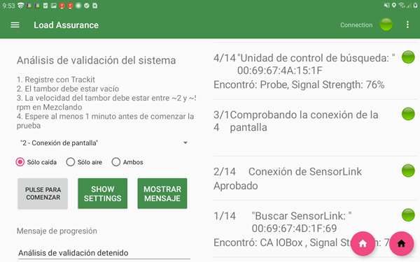 La APK CMDassurance en la tableta tiene una función llamada Validación del Sistema. Esta función verificará toda la configuración de Load Assurance en un vehículo y señalará si hay algún problema. Validación del Sistema está disponible en la versión 5.14 y superiores de la APK CMDassurance. Si su tableta no tiene la función Validación del Sistema, por favor contacte a CMDassuranceSupport@commandalkon.com para actualizar su tableta a la última versión.
