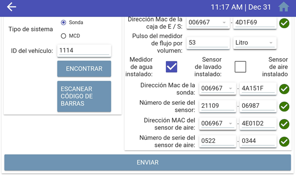 Una vez que haya ingresado todas las nuevas direcciones MAC de Bluetooth, Pulsos del Medidor de Flujo, y Número de Serie del Sensor, toque el botón Enviar